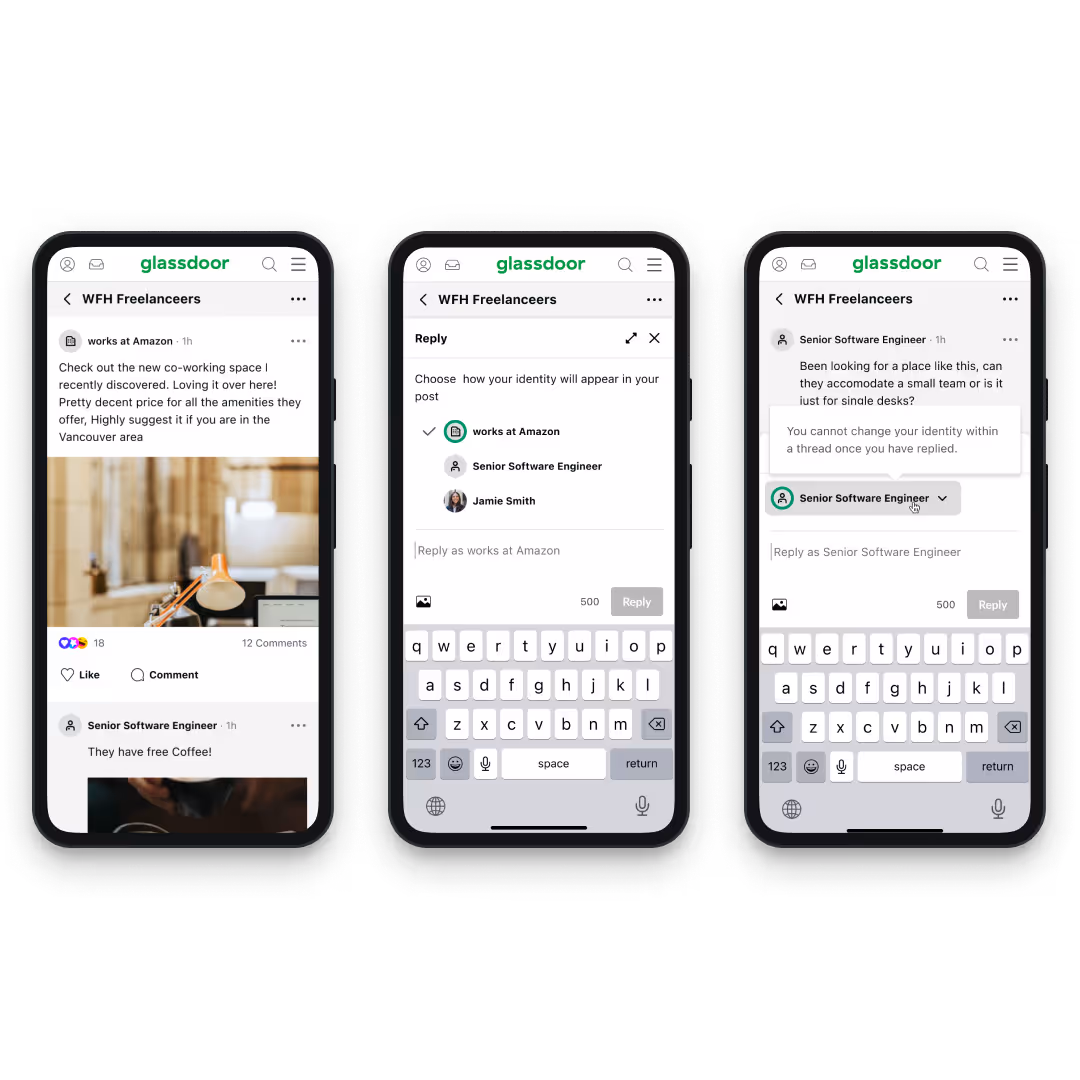 The UX work involved designing seamless user flows that felt native to Glassdoor while preserving the unique value propositions that made Fishbowl successful. This included creating intuitive navigation patterns for the activity feed, designing progressive onboarding that introduced users to new features gradually, and developing profile enhancement flows that supported multiple identity representation methods.