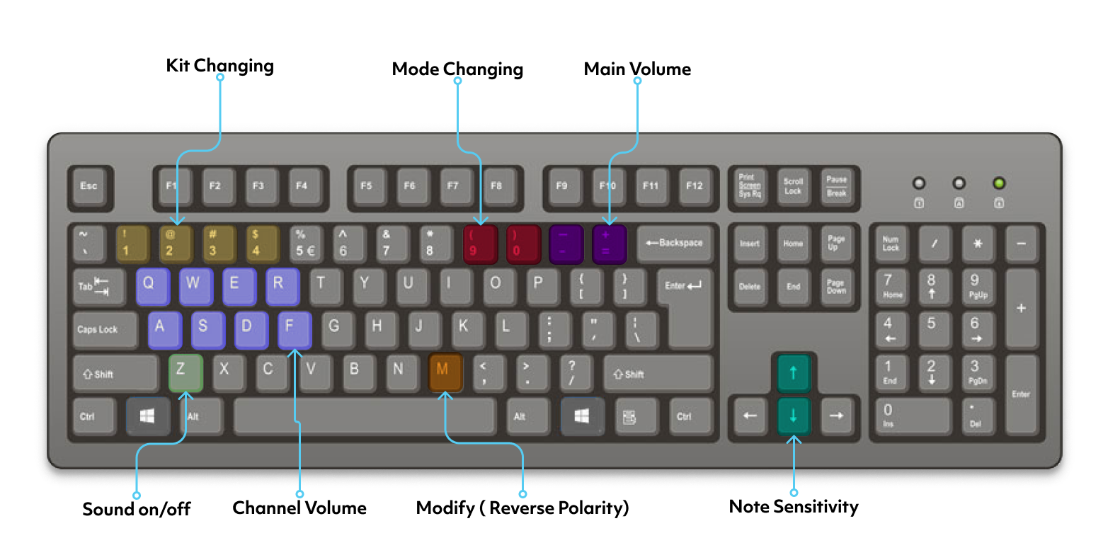 The technical implementation includes individual channel volume controls, global volume management, sensitivity adjustments, and multiple sound kits that can be changed using number keys. The system includes proximity-based volume adjustments to prevent discomfort at loud volumes and prevent repeat triggering of sounds in unintended ways.